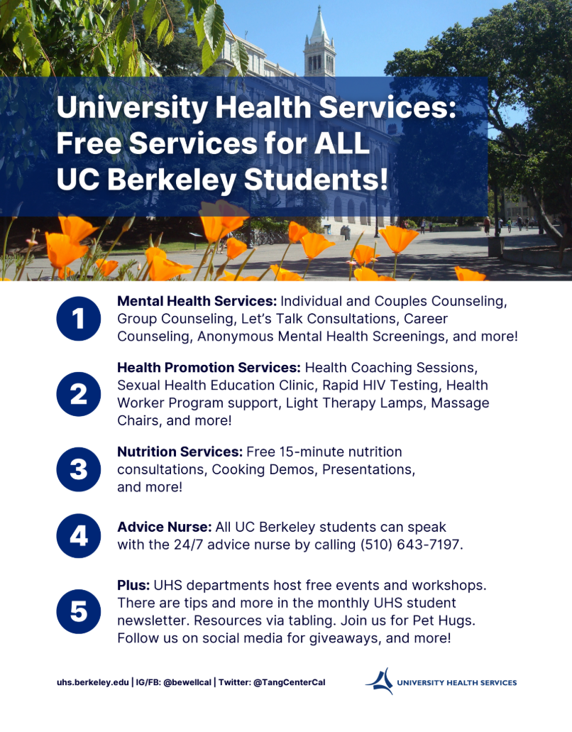 If you have questions about healthcare or insurance at Berkeley, your student health workers are here to help you. All residential halls have health workers that can be contacted by their residents. Review the following flyers for additional information on the Health Worker Program and general information on University Health Services for Berkeley students.